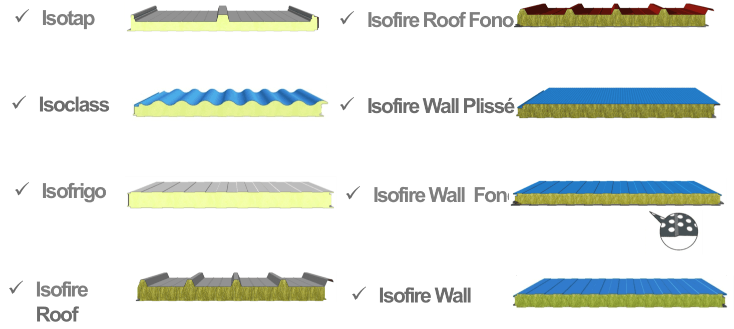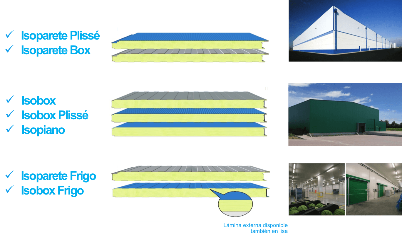 Panel sándwich de pared con núcleo aislante de espuma de poliuretano, utilizado para la realización de muros externos, internos y falsos techos de edificios, industriales y residenciales. Espesor aistlante: desde 1 " hasta 8"